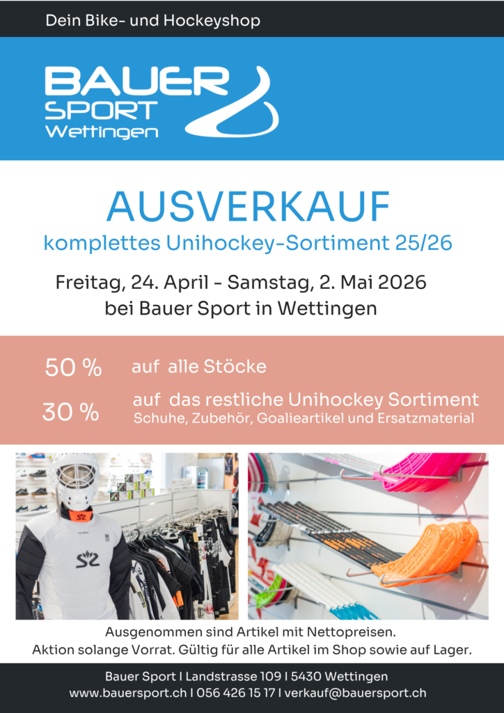 Termin BuchenBevor das Unihockey-Sortiment der neuen Saison eintrifft, starten wir am Freitag mit dem Ausverkauf des kompletten Unihockey-Sortiments 2025/2026. Während einer Woche sind alle Stöcke 50% und das restliche Sortiment 30% reduziert. Also nichts wie los, vom Freitag, 24. April bis Samstag, 2. Mai 2026 geht’s rund!
